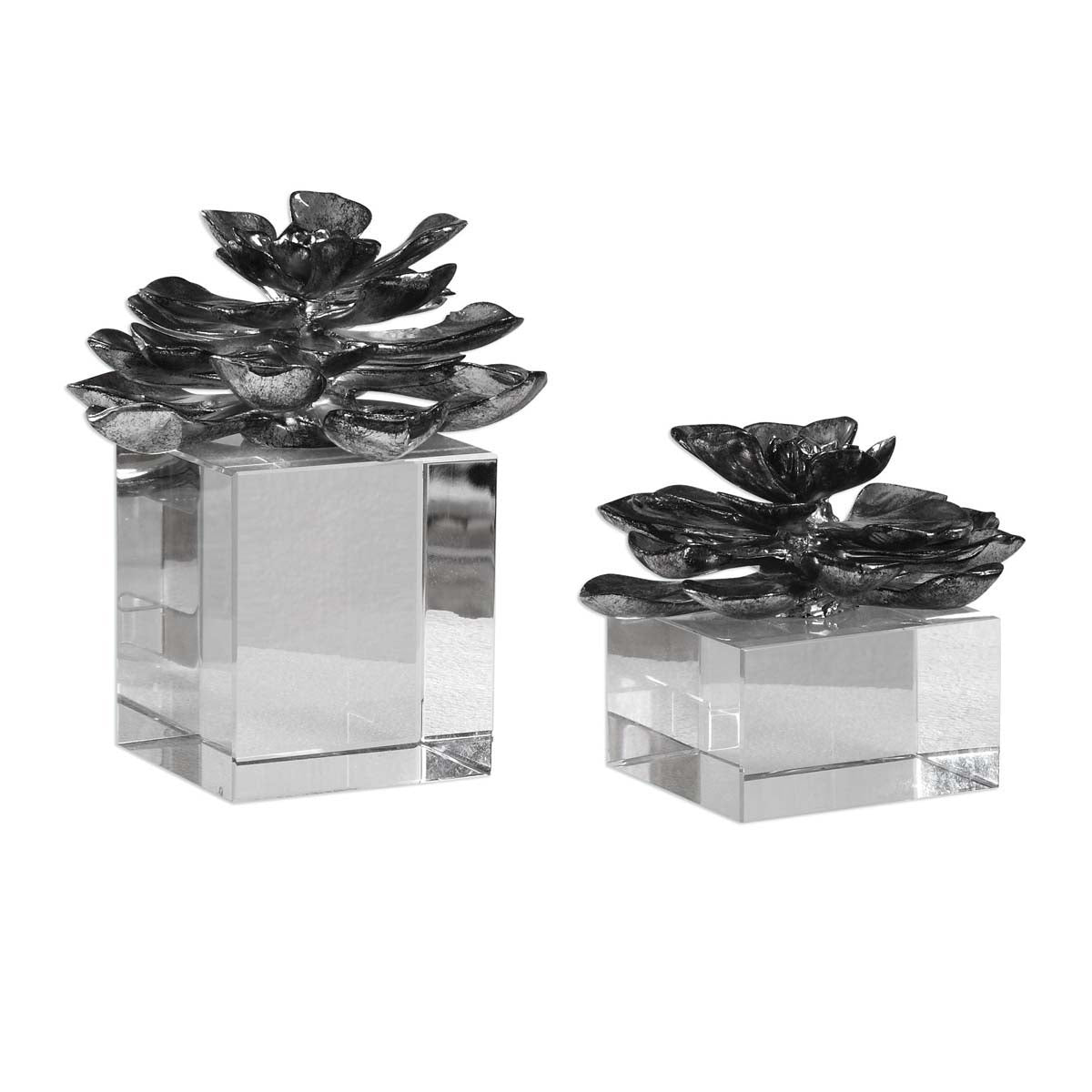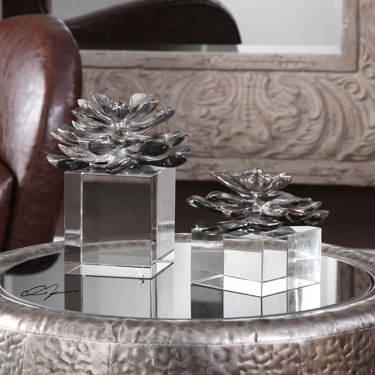 Uttermost's Figurines & Sculptures Combine Premium Quality Materials With Unique High-style Design.With The Advanced Product Engineering And Packaging Reinforcement, Uttermost Maintains Some Of The Lowest Damage Rates In The Industry. Each Product Is Designed, Manufactured And Packaged With Shipping In Mind. Simple Elegance Is Achieved By These Antiqued, Metallic Silver Lotus Blooms That Appear To Be Floating On Clear Crystal Cubes. Sizes: Sm-6x5x6, Lg-6x7x6