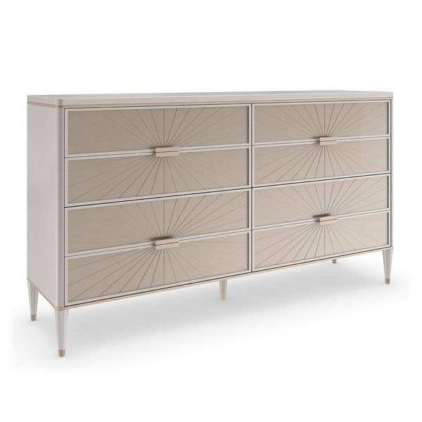 Mirror-like drawer fronts introduce a warmly reflective aesthetic, created from v-groove cut, back-painted glass in a striking radial pattern. A silkscreened pinstripe detail frames the top and adds a touch of luxe, complemented by tapered legs dressed in Bronze Gold ferrules. Eight soft-close drawers offer tucked away storage, with Linen-painted interiors to coordinate with its Matte Pearl frame.