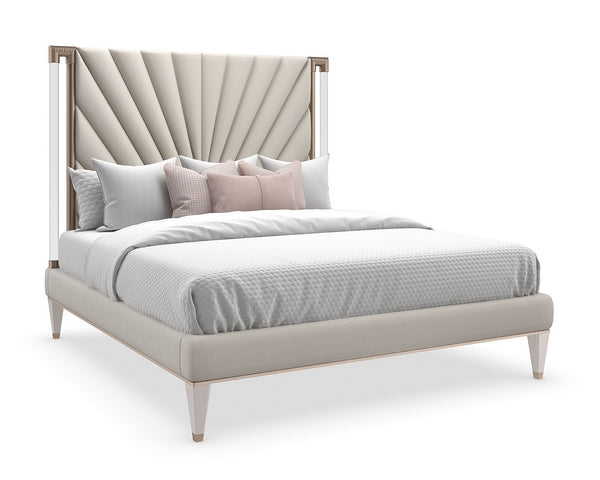 Softly radiating with an air of luxury, the Valentina bed features an exquisitely tailored headboard, composed of individual upholstered wedge panels, elegantly framed by clear acrylic posts. Its subtle layering of color and material lends a soothing presence, artfully accentuated by details in a Golden Shimmer finish.