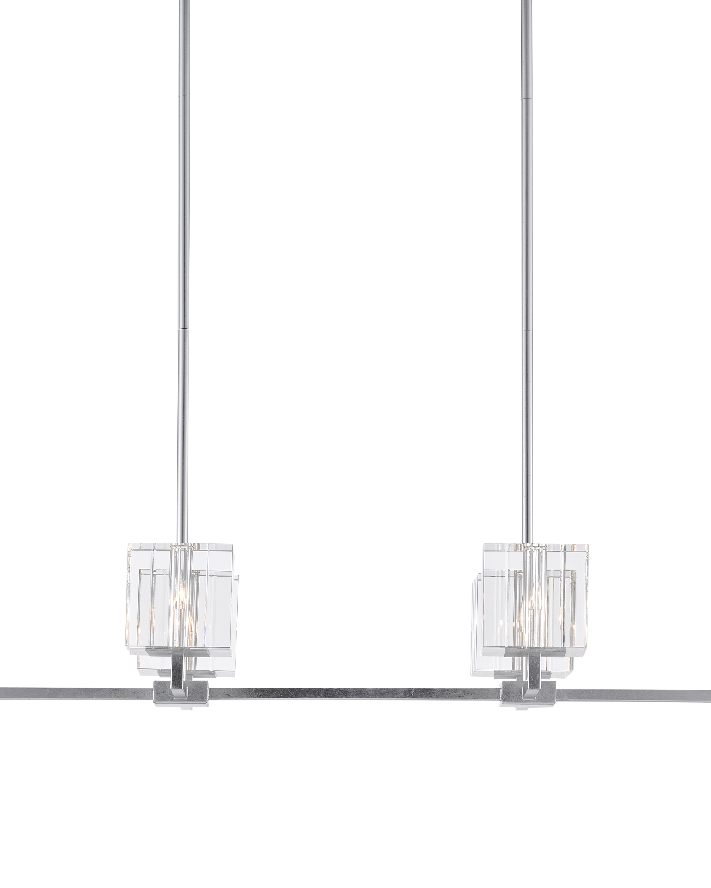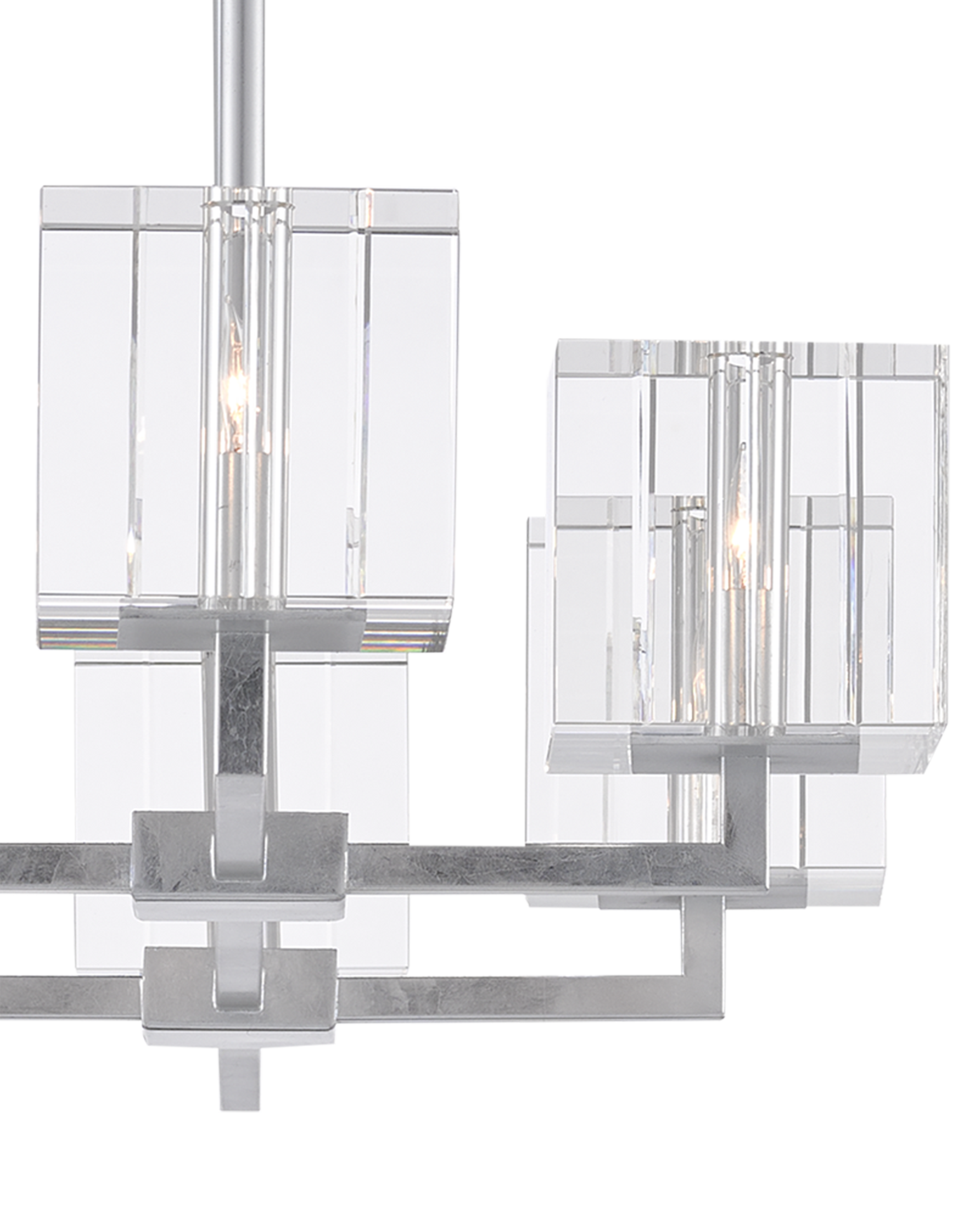 The clean-lined frame of the Valerio Chandelier is set with solid 6-inch by 6-inch crystal cubes with small holes drilled in the center into which the bulbs are inserted. Ian Thornton, who designed the silver chandelier, says, "Lines are carved into the sides of the crystal cubes to create more refraction and enhance the sparkle of the fixture." The Valerio has a silver leaf finish that also contributes to the overall brightness of the crystal chandelier. Adjustable from 22.25" to 58.25" with use of included chain/rod kit/cable. If your space calls for a longer drop, additional chain/rods/cable is available for purchase.