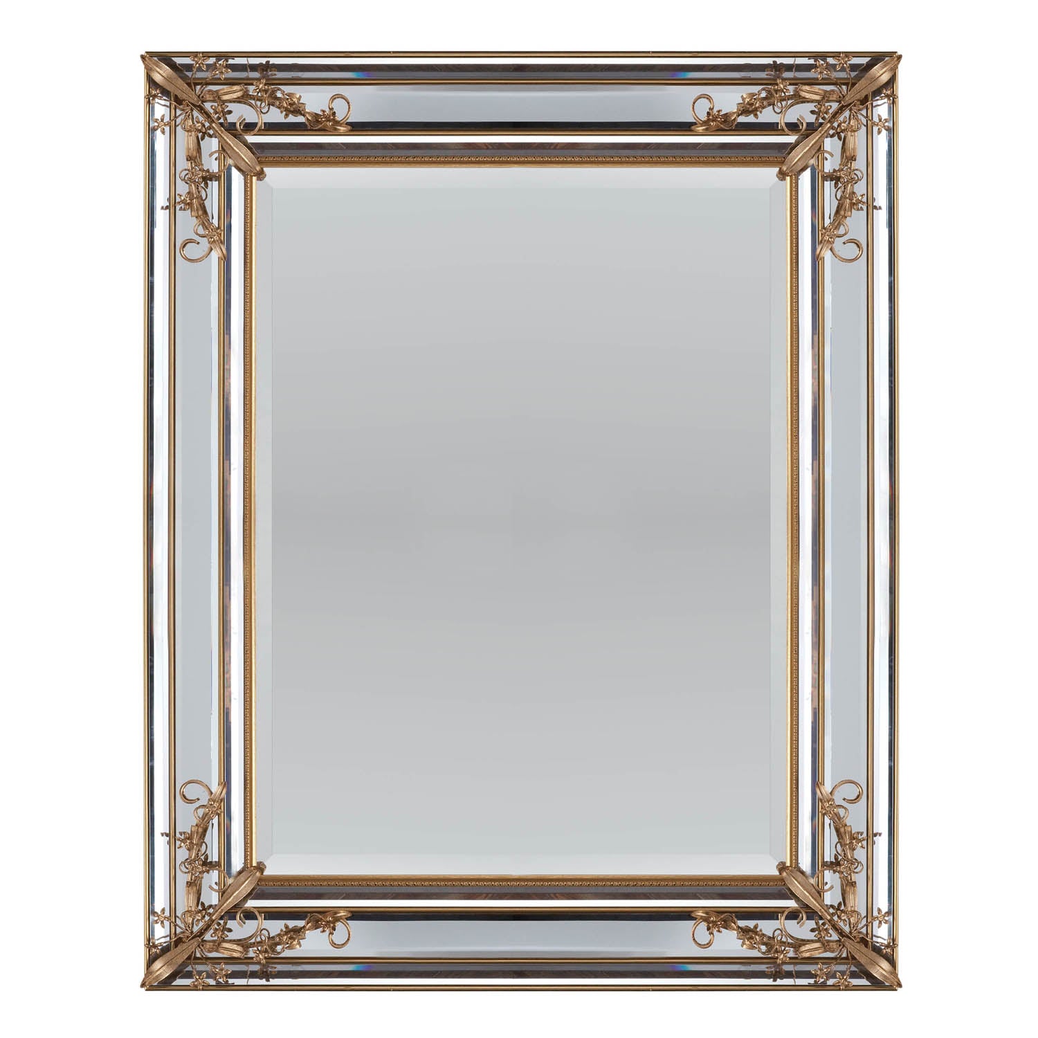 Rectangular Mirror Accented by Gold Floral Decor, Mirrored Borders, Beveled Mirror
