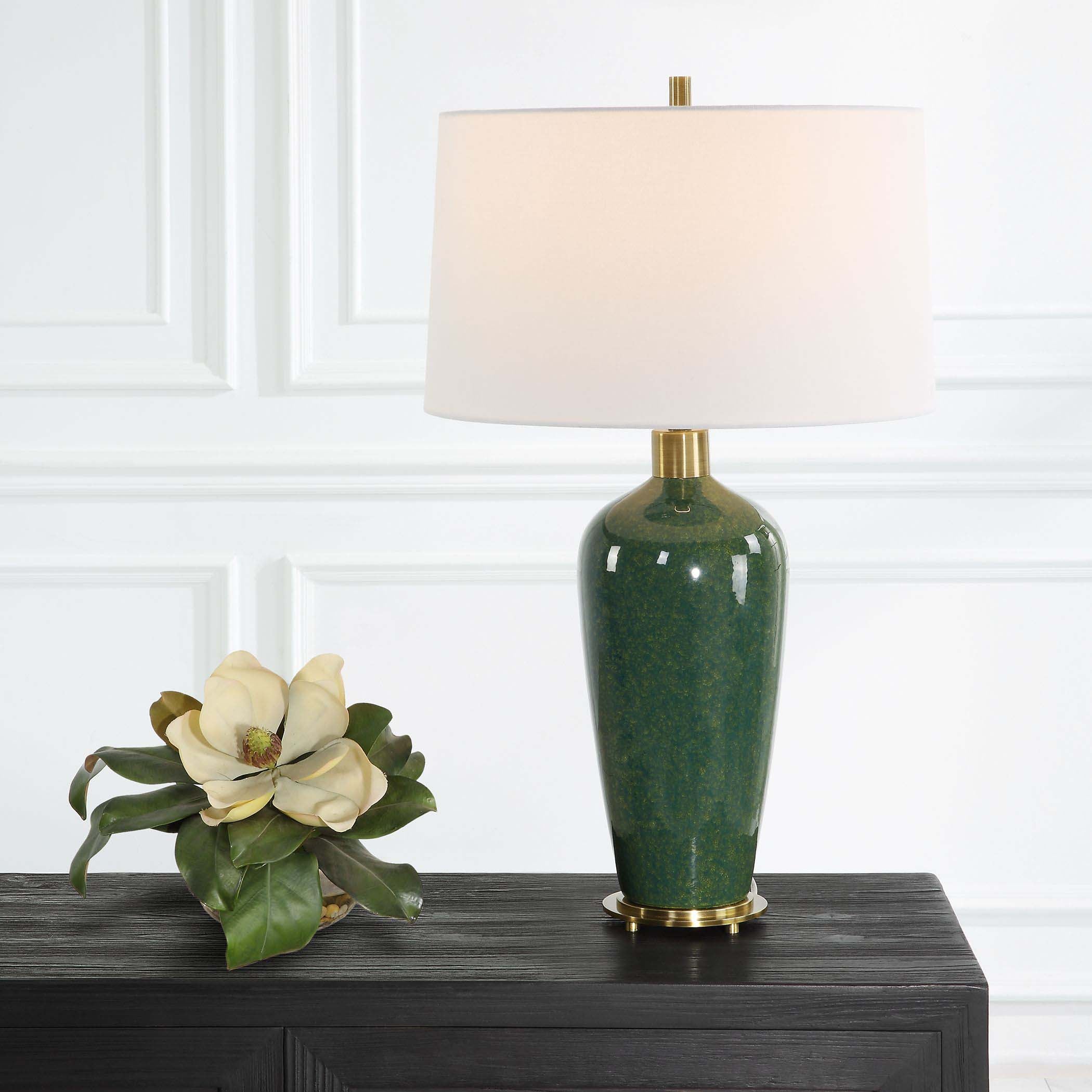 The Verdell Table Lamp Features A Ceramic Base Finished In A Mottle Dark Mossy Green Glaze Accented With Lightly Antiqued Brass Plated Details.