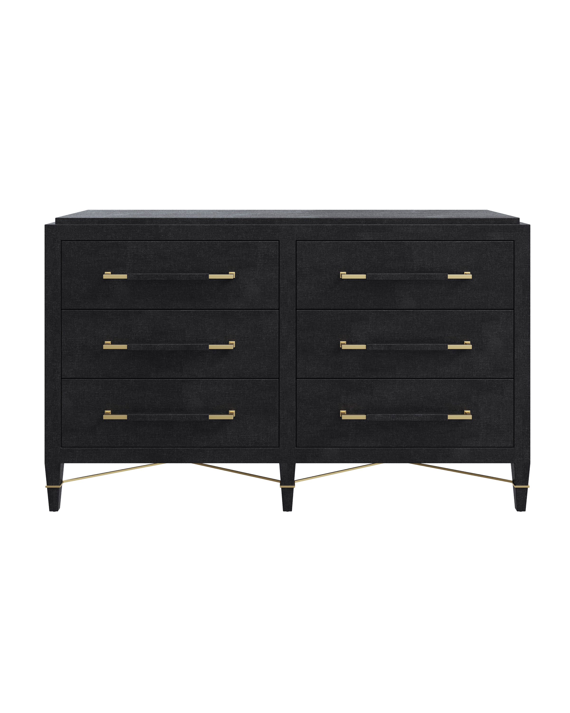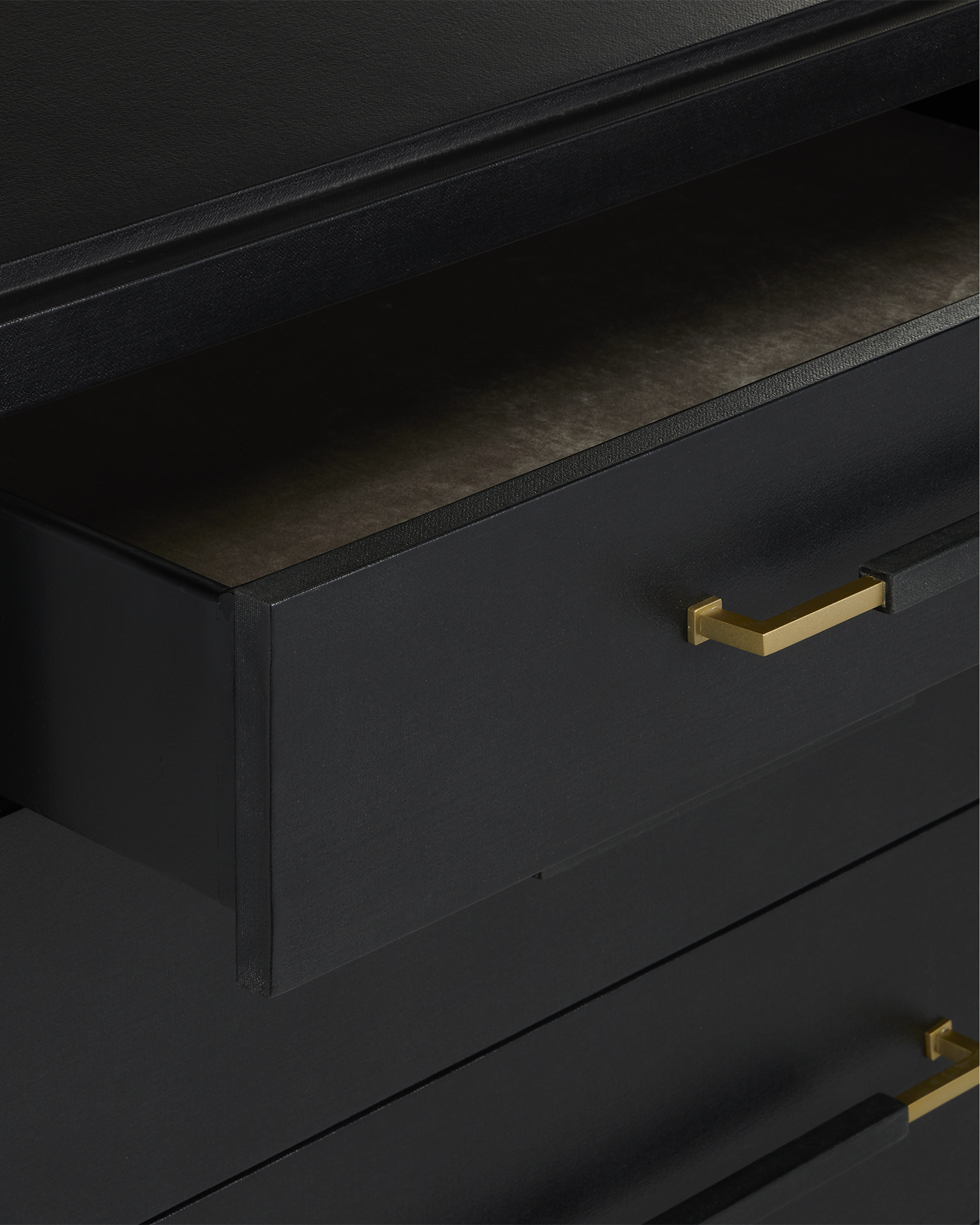 Blending sleek sophistication with refined craftsmanship, the Verona Black Six-Drawer Chest is made of mahogany and wrapped in lacquered black linen. Angular metal pulls in a champagne finish introduce a hint of glamour, while the center of each pull is thoughtfully covered in matching black lacquered linen to seamlessly tie the design together. A coordinating stretcher in a champagne finish brings an understated luxury to the chest.