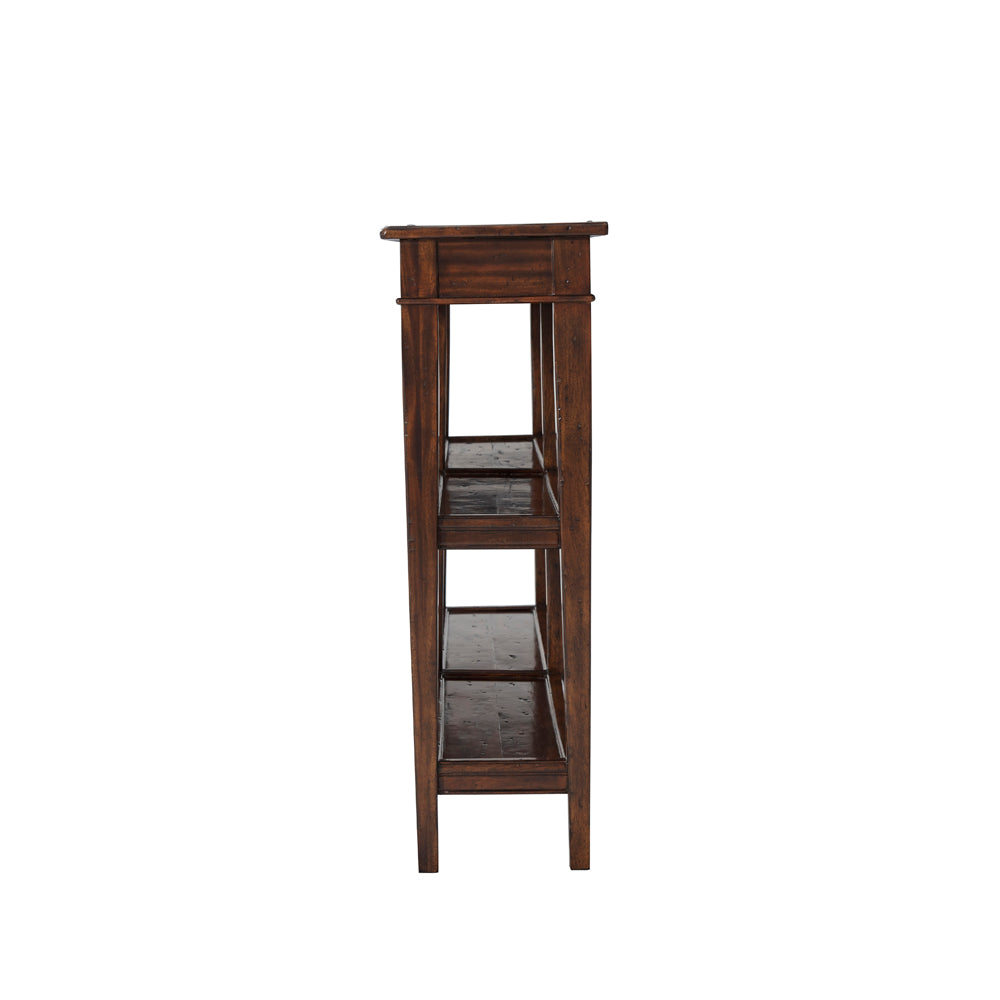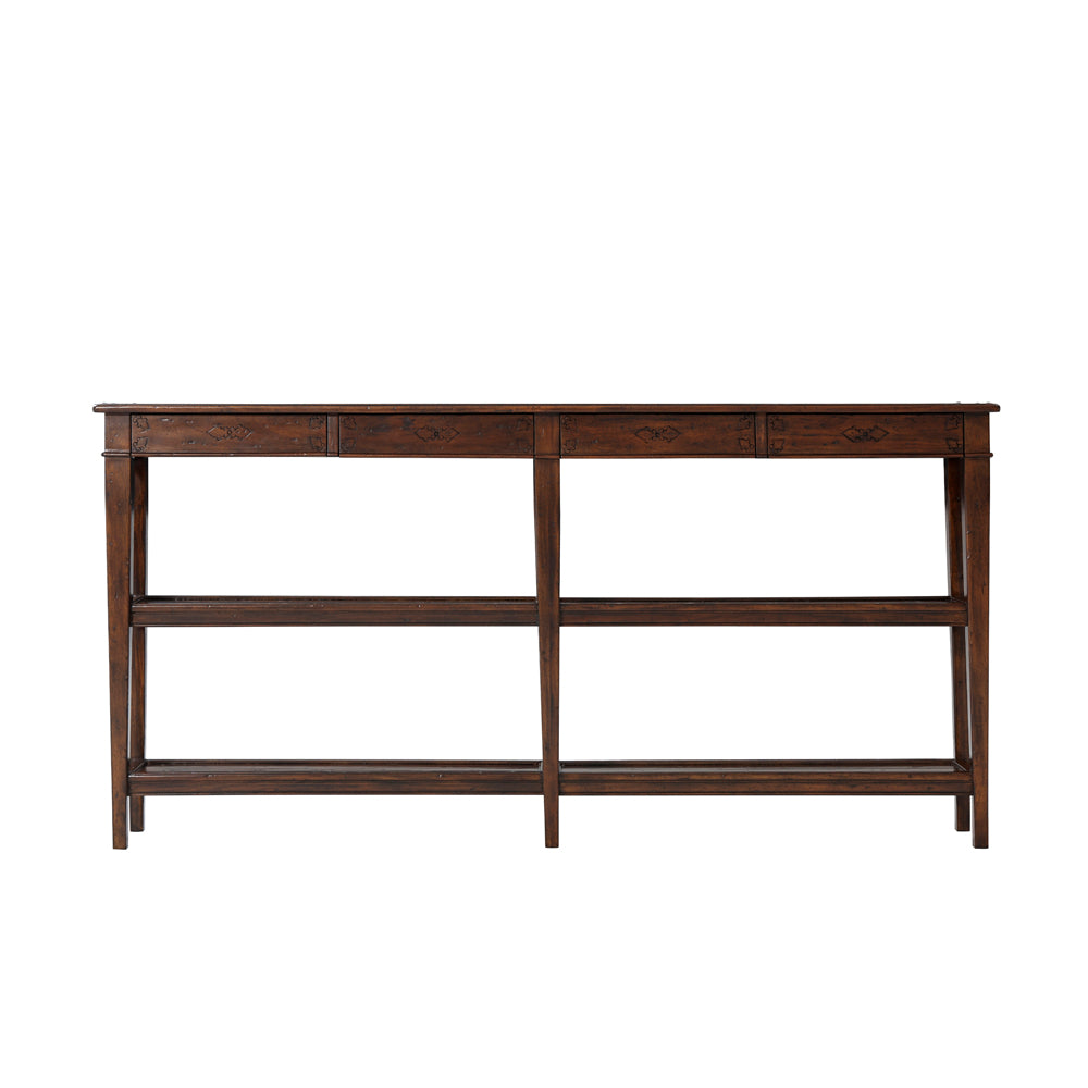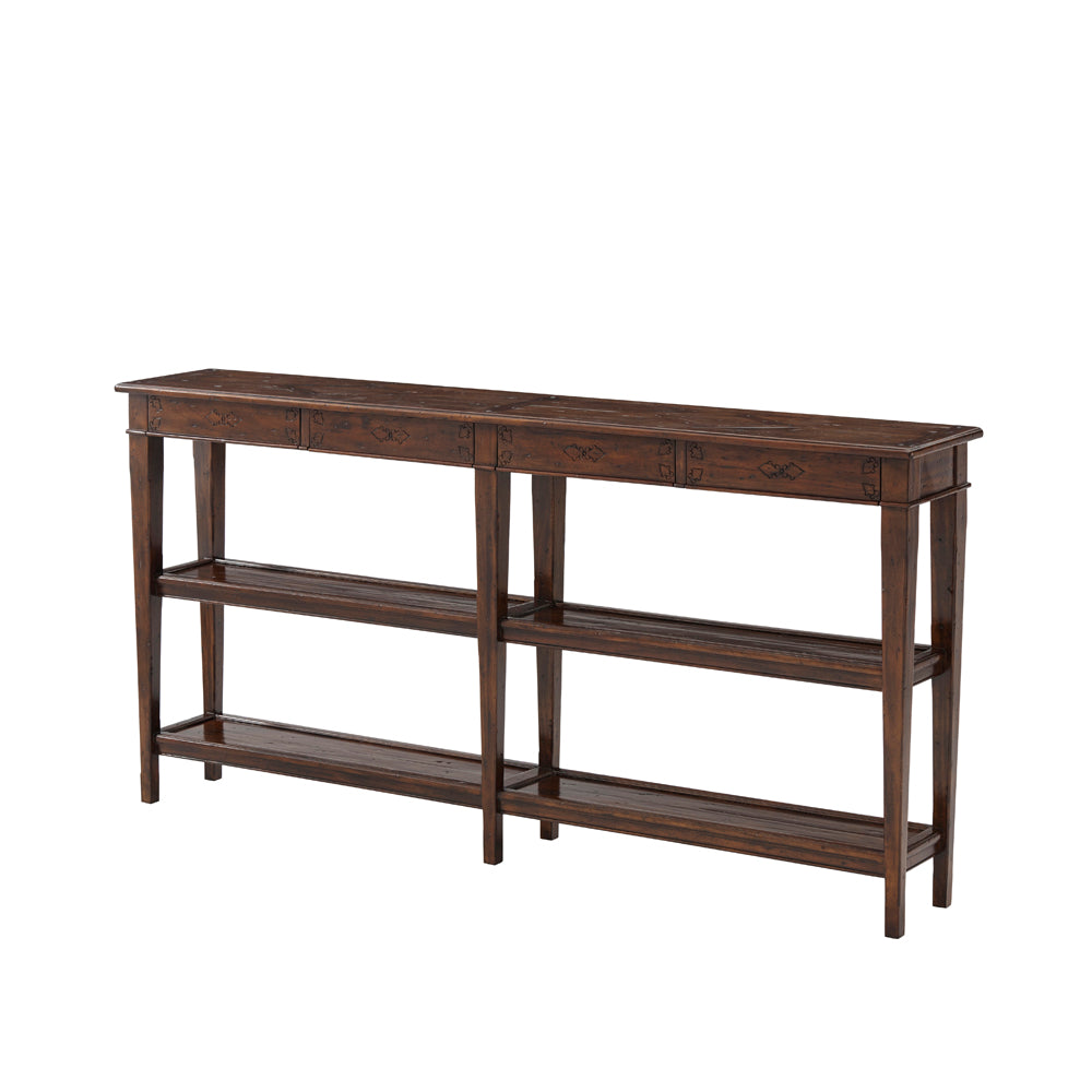 An antiqued wood console table, with four frieze drawers and two further tiers between square tapering supports. The original French Provincial.