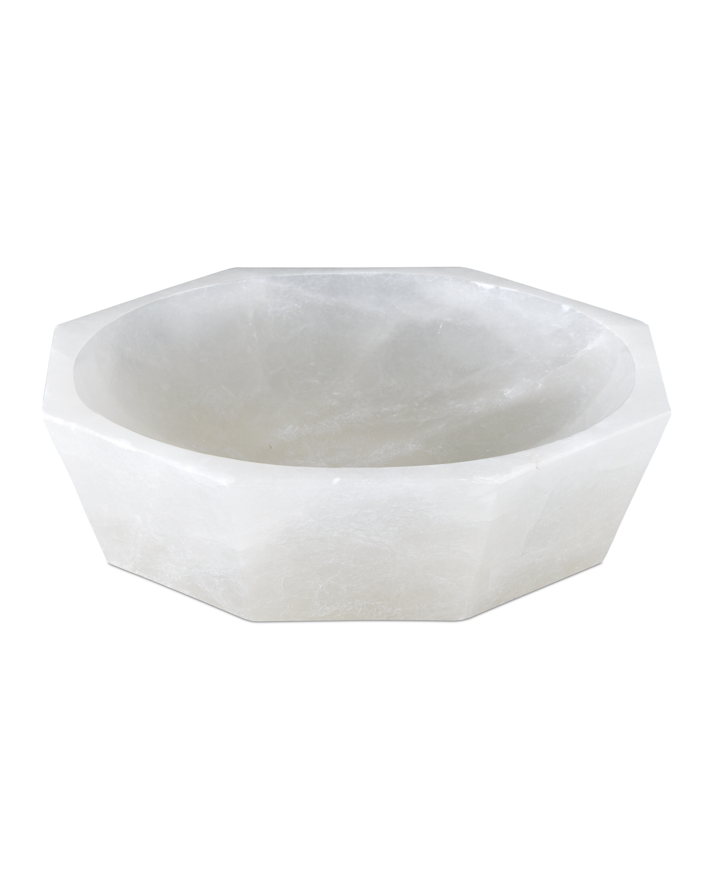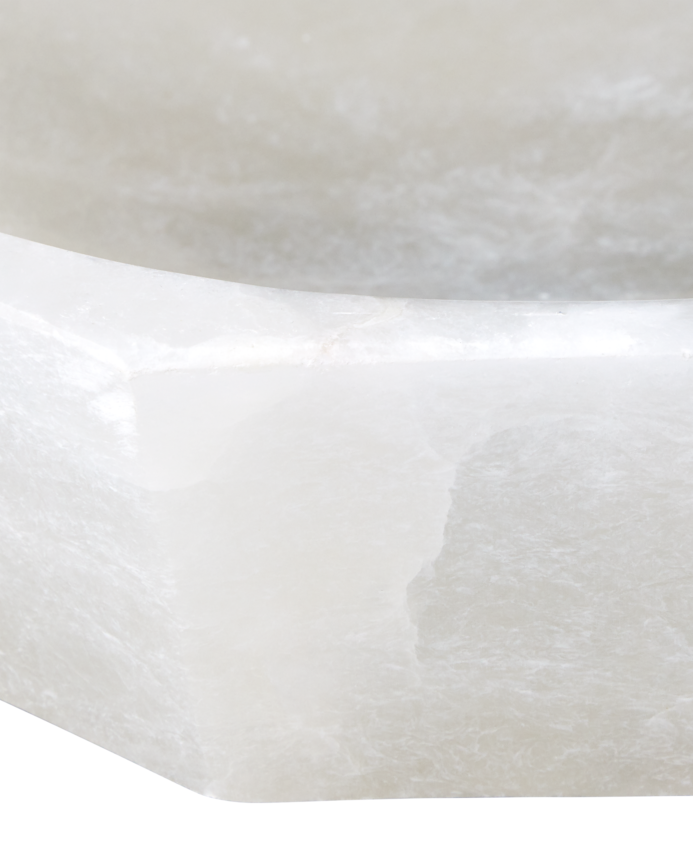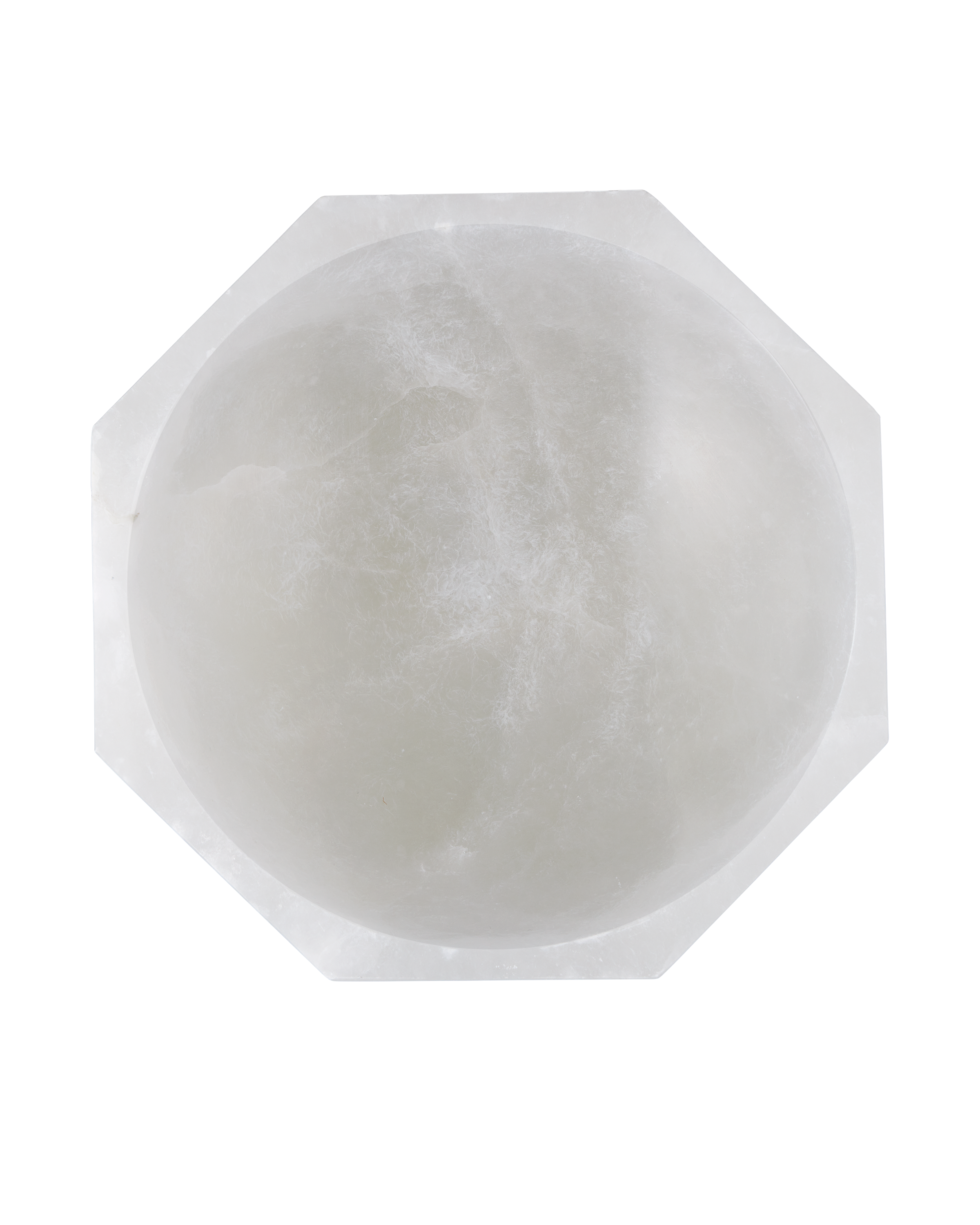 The Waystone Bowl is a luminous white decorative bowl made of natural alabaster. The prized material has been hollowed out and carved into an octagonal shape as the stone was smoothed. This alabaster bowl is perfect for displaying decorative objects like colorful glass balls or left to shine on its own.