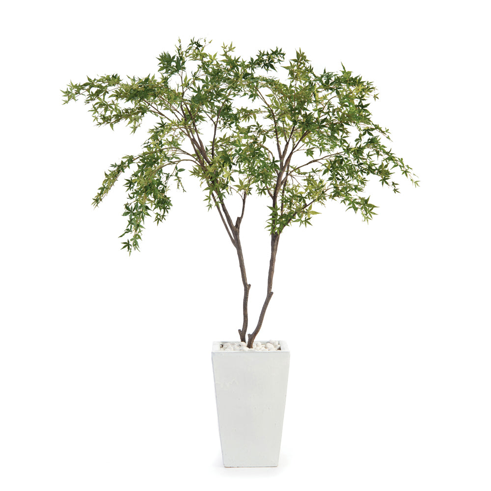 A glazed white pottery pot holds twin maples secured with natural rolled white marble.