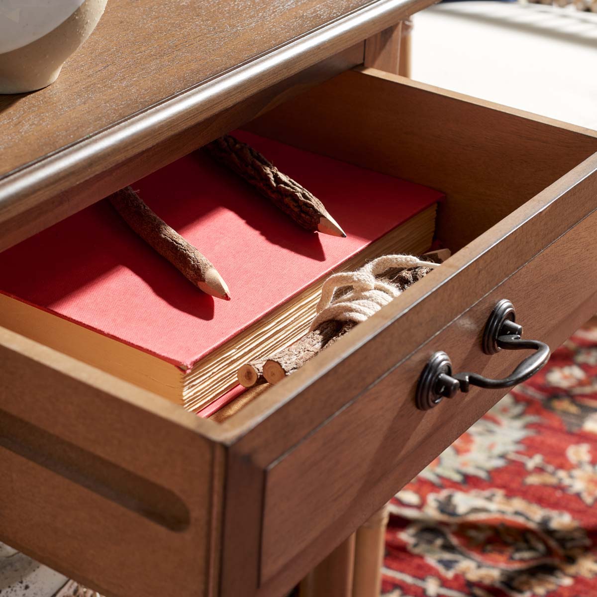 This Whitney Accent Table emanates farmhouse charm in any classic contemporary d??cor. At once understated and sophisticated, Whitney's carved details bring rich depth and intrigue to its decor smart finish. An open bottom shelf and drawer provide ample display and storage space.