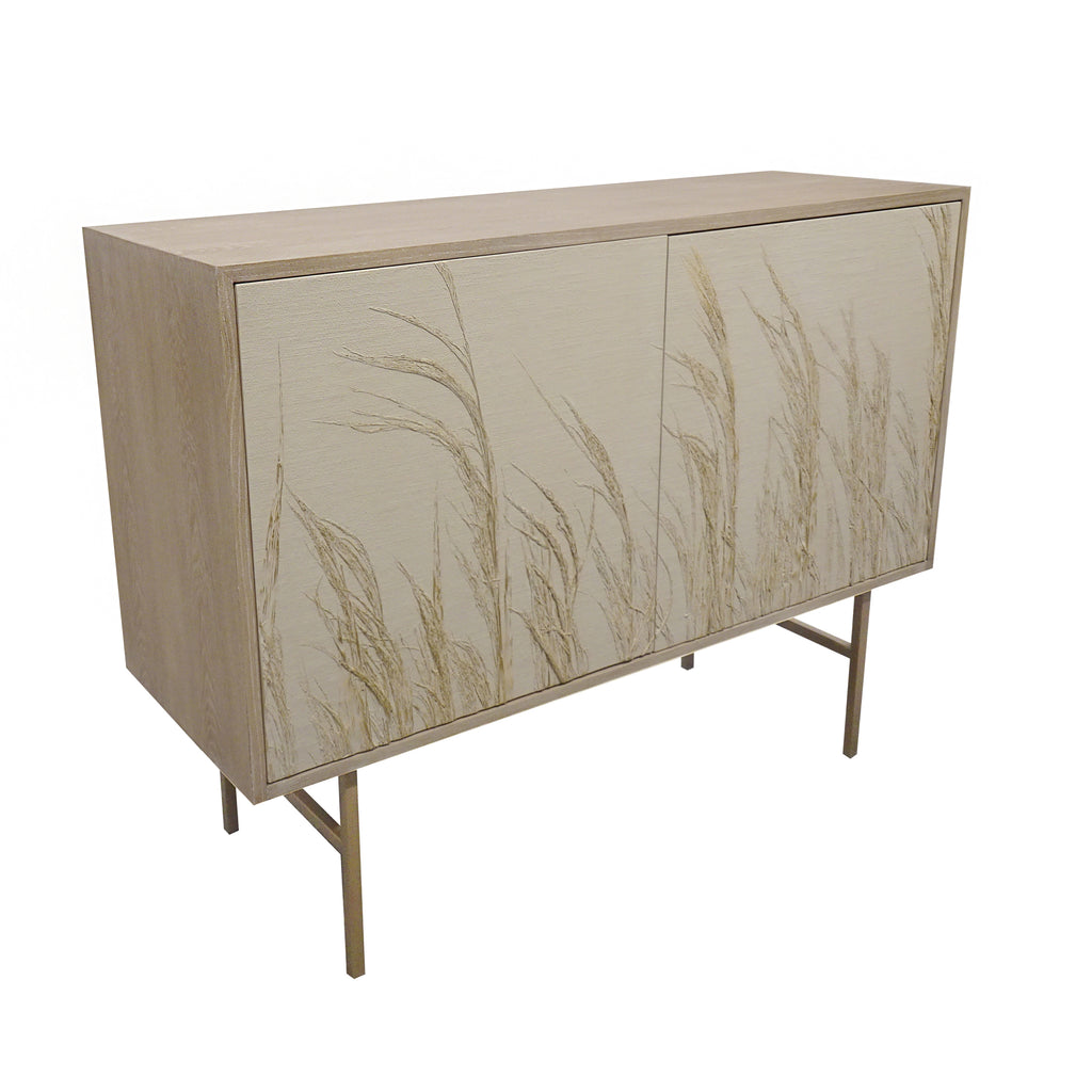 The Windswept Chest is a gorgeous blend of agrestic charm and chic sophistication. The rectangular frame showcases natural oak wood grain with a Washed finish that is tastefully juxtaposed against an arrangement of Gold Leaf reeds swaying gently in the wind. A sleek, minimalistic stainless steel base features four slender legs in a brass finish complement the pair of gilded doors. This piece comes equipped with push latches, European hinges, and a single interior compartment with an adjustable shelf.