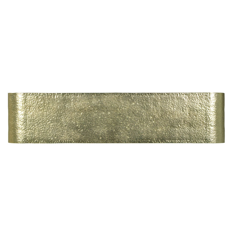 A handsome textured metal table with a rectangular top that waterfalls downward to slab ends.