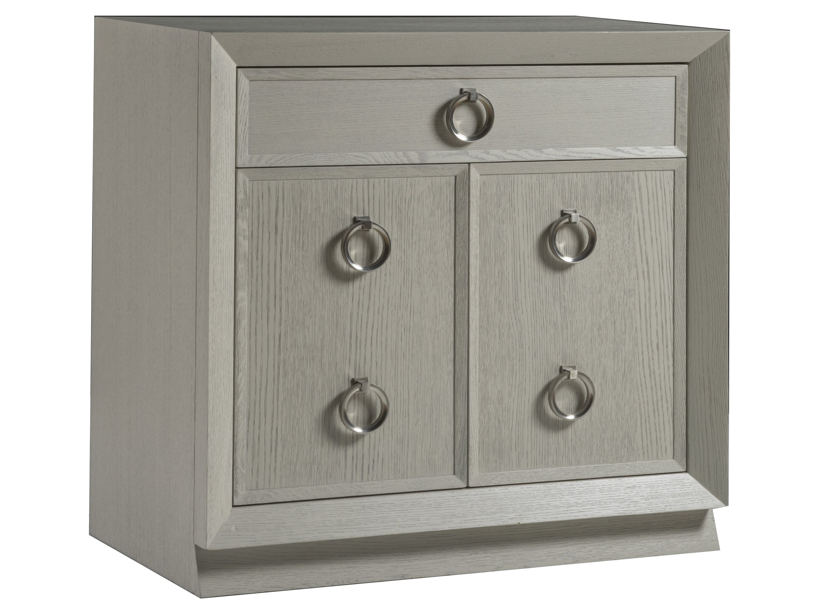 Beautifully proportioned case with architectural lines and repeated chamfered moldings, all dressed in white oak wire brushed ceruse. There are four Zeitgeist silhouettes designed to either stand alone or be grouped together in dramatic wall configurations, with the depth differential creating a breakfront effect. This chest includes two doors, one drawer, one adjustable shelf with a ventilated and removable back panel for media components. Two doors, one drawer, one adjustable shelf, ventilated and removable back panel. White and gray wire brushed ceruse finish , SIGNATURE DESIGNS ,